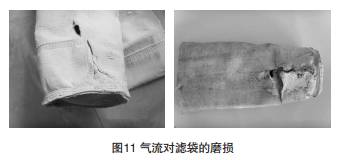 過高的過濾氣速會使粉塵沖擊、磨損濾袋,也會使 濾袋的織物纖維張力受損。除塵器的進氣分布不均,容 易使高含量的大顆粒粉塵直接沖擊局部濾袋,造成廢氣 進口處部分濾袋穿孔(如圖11)。