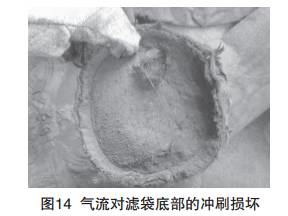 合理的設計是保證濾袋壽命的前提,但在袋式除塵 器設計過程中往往過分注重各項經濟指標,而易忽視過 濾室箱體內氣流流場分布的合理性。由于氣流分布不合 理,會導致袋間速度過快,造成濾袋損壞的現象時有發 生。好典型的是早期機械回轉扁袋除塵器,其過濾箱體 內濾袋布置密集度是現有除塵器中好的,由此造成氣流對濾袋的沖刷損壞(如圖14)。濾袋的長徑比選擇不 合理,也會造成袋口速度過快而磨損濾袋。